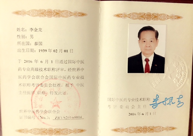 แพทย์จีนประจำโรงพยาบาลเซนต์หลุยส์, นายกสมาคมกิตติมศักดิ์ตลอดชีพแพทย์แผนจีนประเทศไทย,